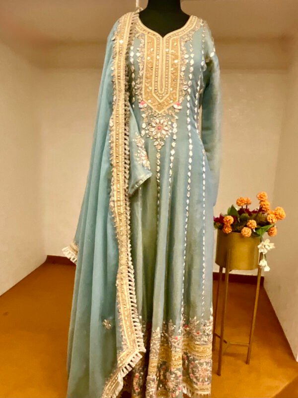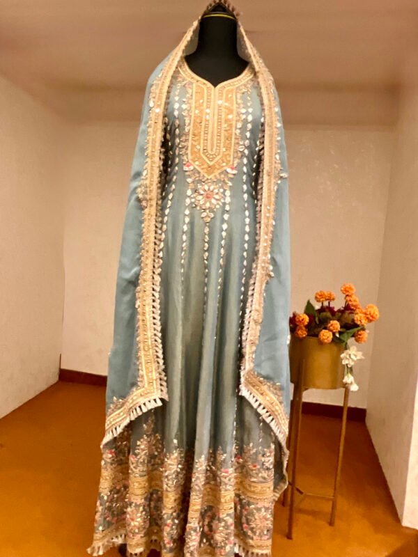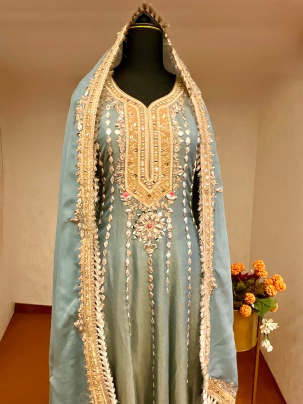 Step into elegance with this exquisite light blue traditional dress, beautifully adorned with intricate gold and silver embroidery and delicate mirror work.