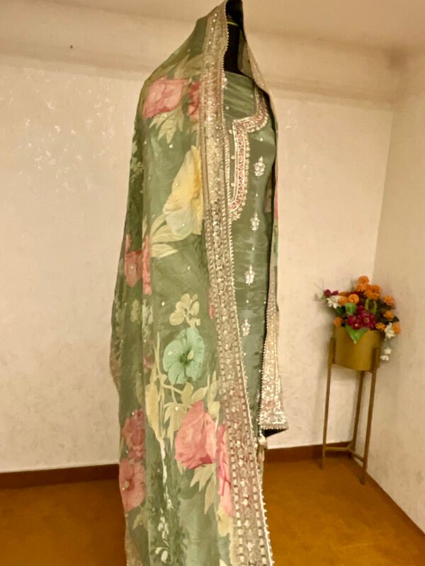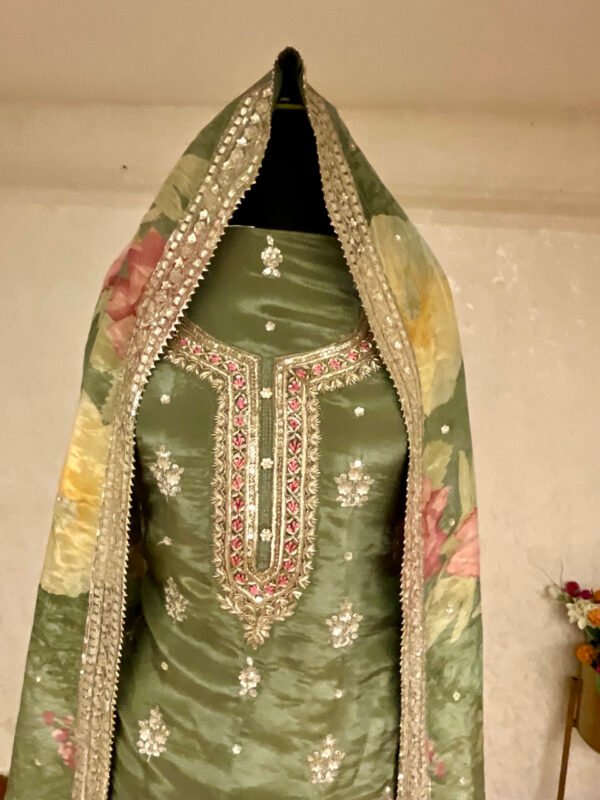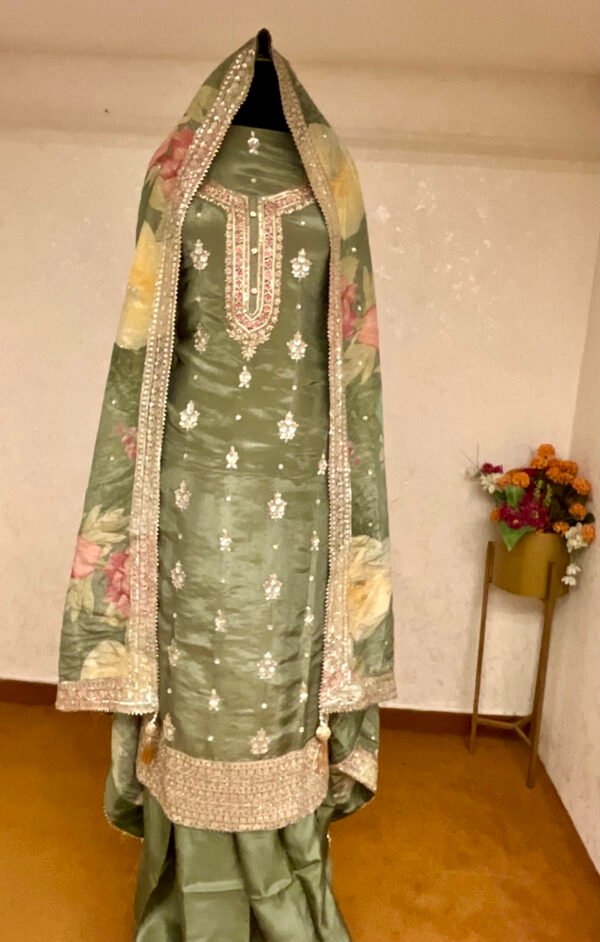 Experience timeless elegance with this olive green salwar kameez featuring intricate embroidery and detailed embellishments. Paired with a beautifully floral-printed dupatta bordered with delicate beadwork, this set is perfect for festive occasions and traditional celebrations.