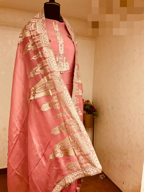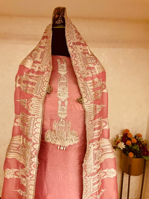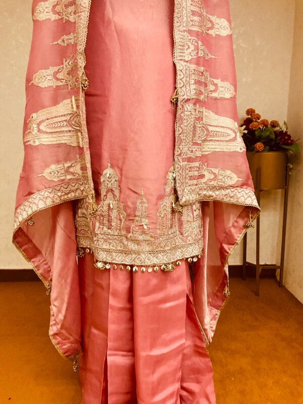 Step into timeless elegance with this stunning pink traditional dress, exquisitely adorned with intricate golden embroidery inspired by architectural motifs. Crafted from high-quality fabric, this outfit offers a perfect blend of comfort and sophistication. The beautifully detailed matching dupatta features delicate embroidery and bead accents along the borders, enhancing the overall regal look.